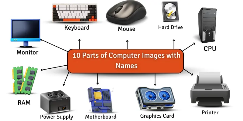 قطعات سختافزاری اصلی: کارت گرافیک، پردازنده، مادربورد، RAM، SSD.